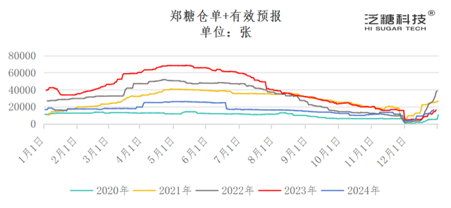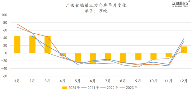 确认泛糖科技颖慧储运平台数据,欺压12月20日,广西食糖第三方仓库库存数目约18万吨,较客岁同时增多约7万吨,但较近3年的同时均值下降约28万吨。