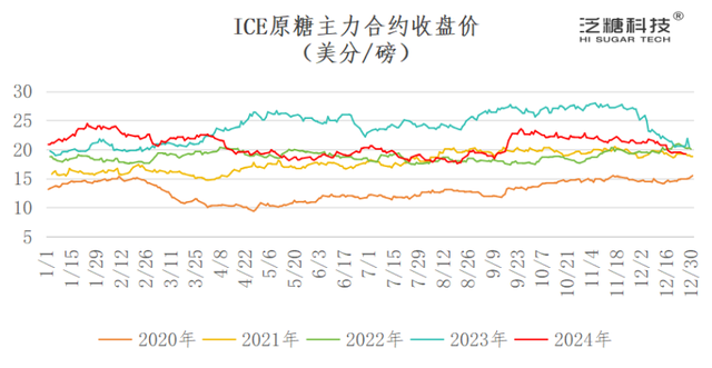 本周,海外糖价全体裂缝下行。北半球食糖出产程度加快,加之原白糖价差看守低位,需求疲软对商场信心组成压制,导致ICE原糖期价震撼偏弱。另一方面,由于出口老本的撑抓,糖价下降空间亦有限。12月上半月,巴西中南部产糖34.8万吨,同比下降63.07%;2024/25榨季欺压12月上半月,累计产糖3971.1万吨,展望本榨季产糖在4000万吨傍边。跟着巴西榨季参预尾声,其对海外糖市的影响力平缓裁汰,在北半球产量落定之前,展望短期原糖价钱反弹驱动较弱。