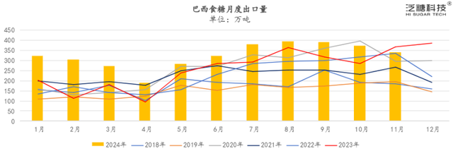 2023年12月,巴西糖出口量为379.25万吨,日均出口量为18.96万吨。