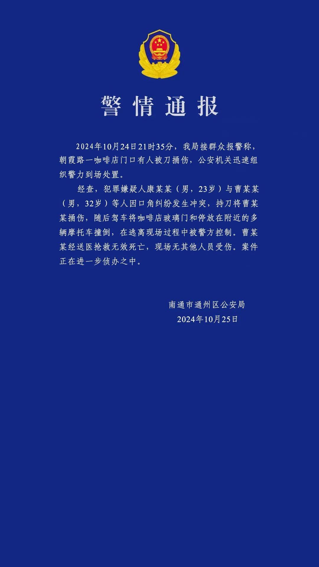 据江苏南通通州警方通报:2024年10月24日21时35分,南通市通州公安局接群众报警称,早霞路一咖啡店门口有东说念主被刀捅伤。